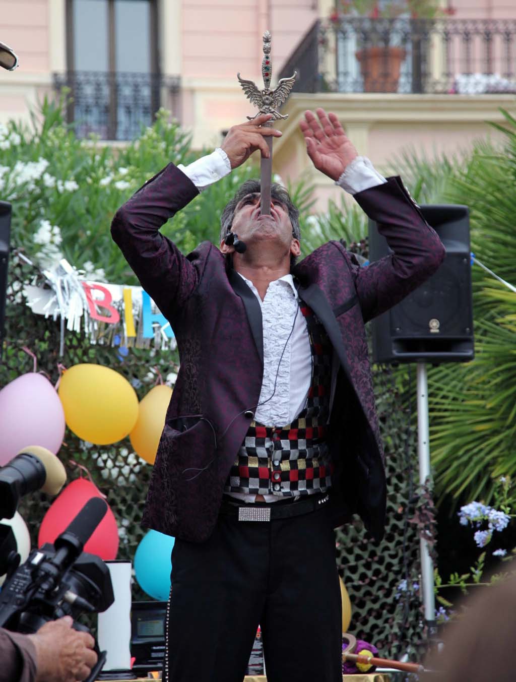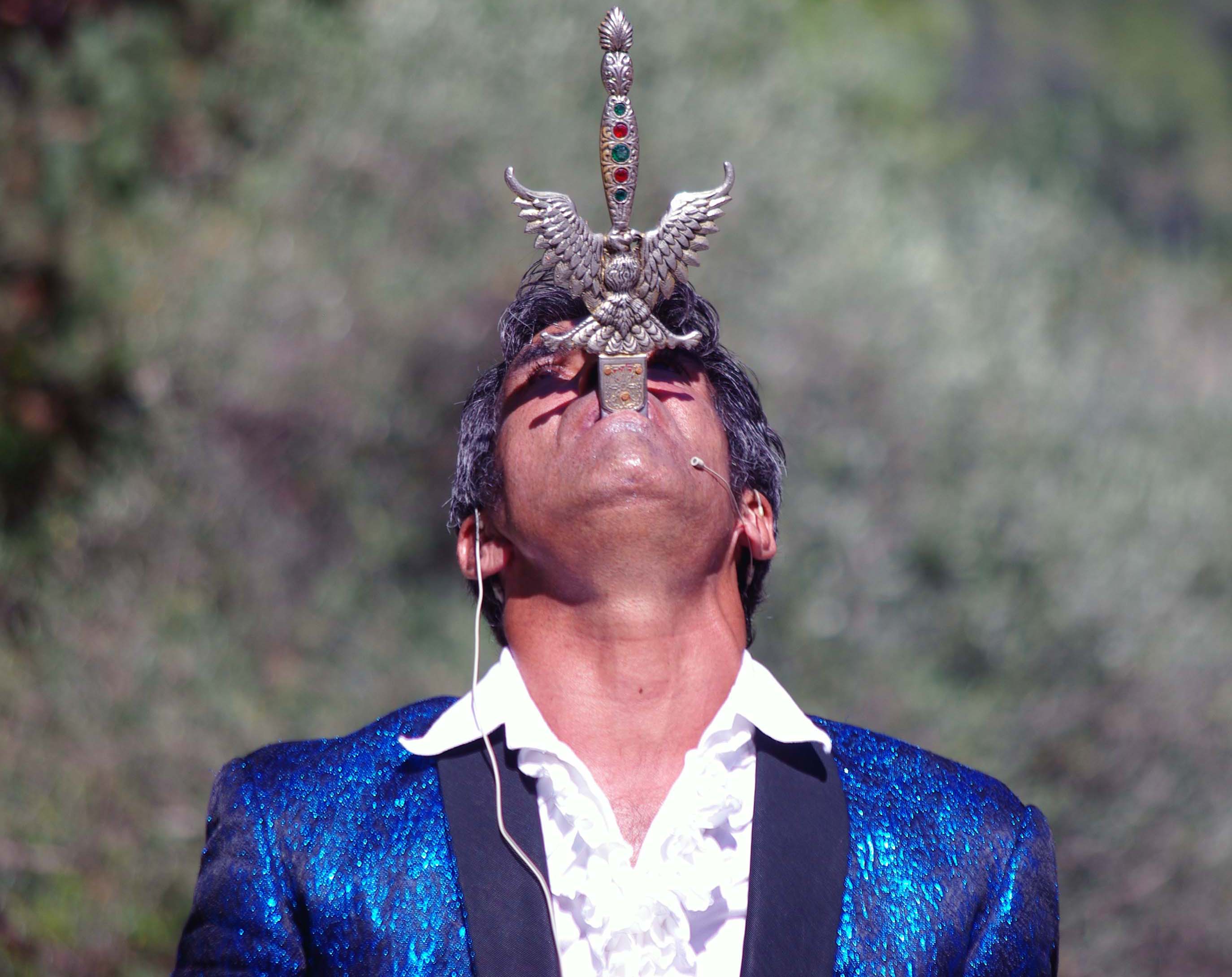 C’est pourquoi, MIKE, pour vous, va renouveler ces prouesses en exécutant son numéro impressionnant d’AVALEUR DE SABRE. Une lame d’acier de 70 centimètres va pénétrer à travers sa gorge, frôlant son artère pour finir sa course à 15-20 centimètres du fond de son estomac.